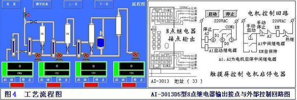 在流程圖中可操作按鈕;控制按鈕連接AI-3013D5開關(guān)量8路繼電器輸出模塊,地址設(shè)33號(hào),圖中開關(guān)按鈕可控制4臺(tái)電機(jī)啟停;連接AI-3011D5開關(guān)量8個(gè)輸入干接點(diǎn),地址37號(hào),顯示設(shè)備運(yùn)行狀態(tài);點(diǎn)擊圖中的數(shù)據(jù)框:【TIC-101】回到【單條曲線】通道。